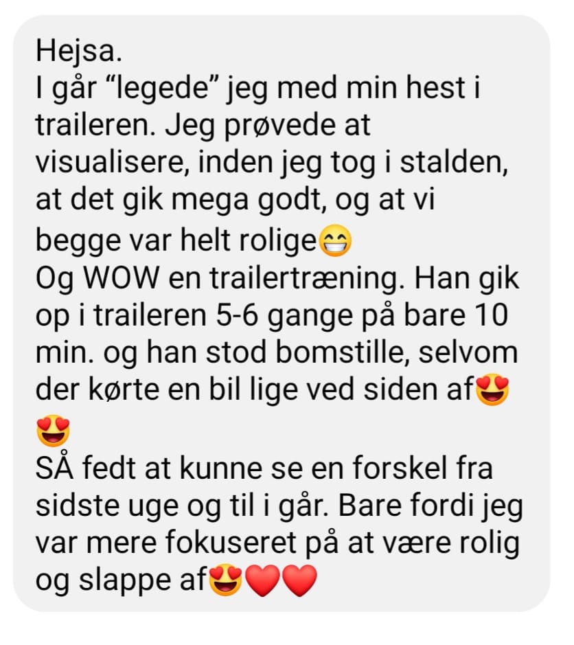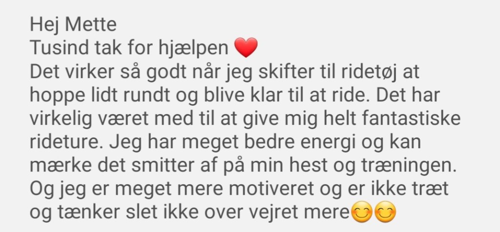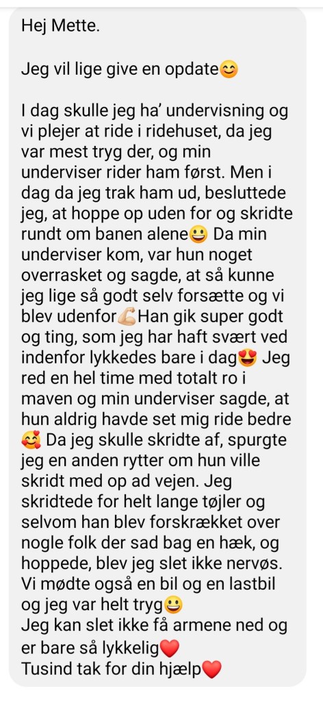 Feedback fra voksen rytter som var utryg når hun red. Hun var bange for at komme til skade med hendes lidt skrøbelige krop. Efter en snak på bare 30 min. fik hun redskaberne til at komme videre i sin ridning og få en god tur med ro i maven.